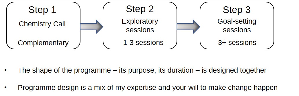 A typical example of what happens next could be a set of six sessions where we work on identifying the changes you will make and setting real actionable goals. The practice of actually making changes will begin at the right time for you, in the supported context of the coaching.